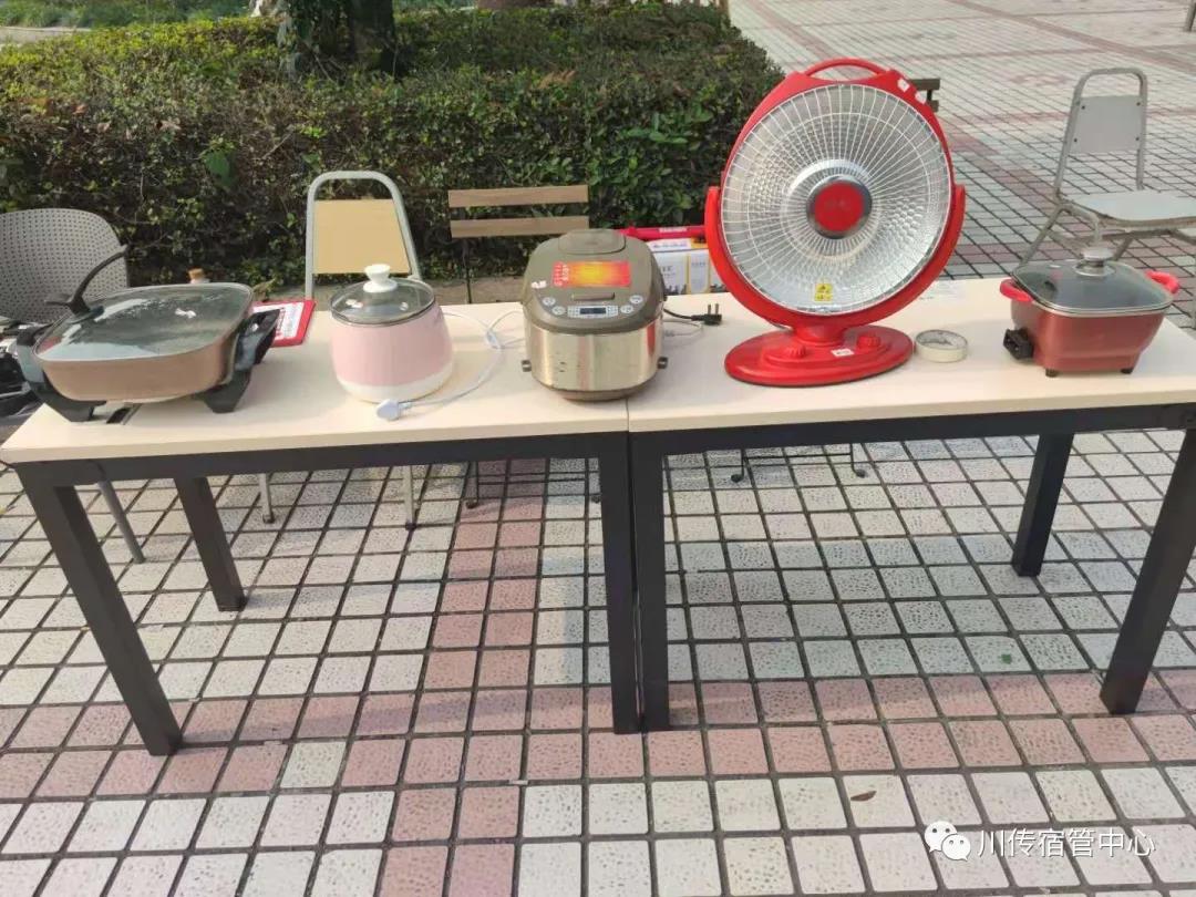 本次活动对学生公寓近几年来查处并代为保管的各类违禁物品进行了实物展示,在日常寝室检查中没收的违禁物品,如锅、电饭煲、电水壶、电热毯、电暖气、卷发棒以及管制刀具等等。
