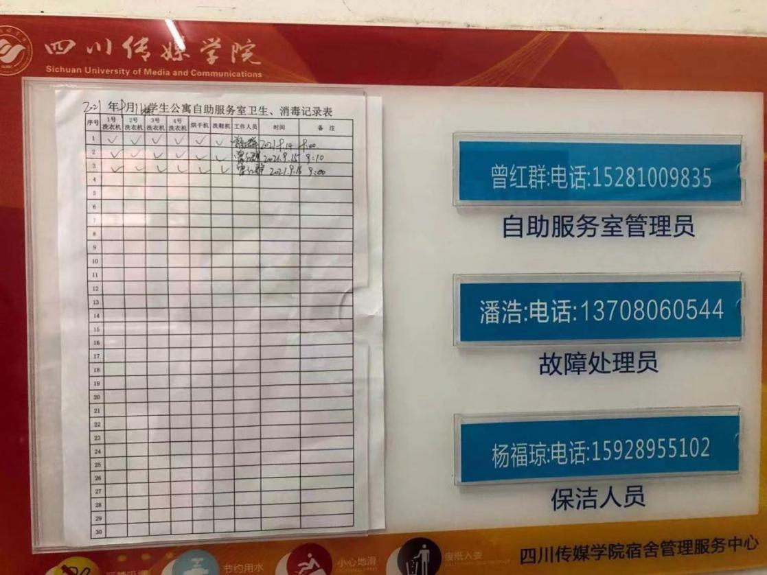 针对学生反映自主洗衣房消毒和清洁不及时问题,宿管中心协调保洁人员和宿管员认真落实整改,并要求每天进行洗衣房、洗衣机的卫生保洁和消毒工作,并做好每日记录备查。