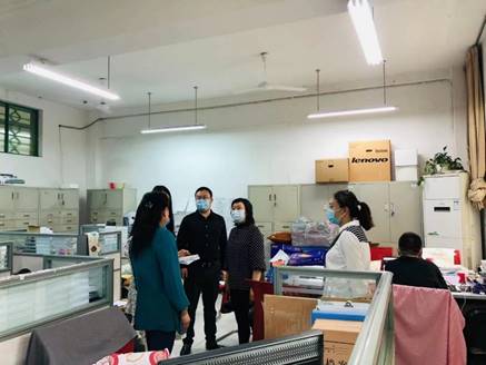 2022年5月23日,财务处、后勤管理处一行人员对有声语言艺术学院、戏剧演艺学院、艺术设计与动画学院进行了走访。查看了办公用品的领取、使用、登记和库存等情况。