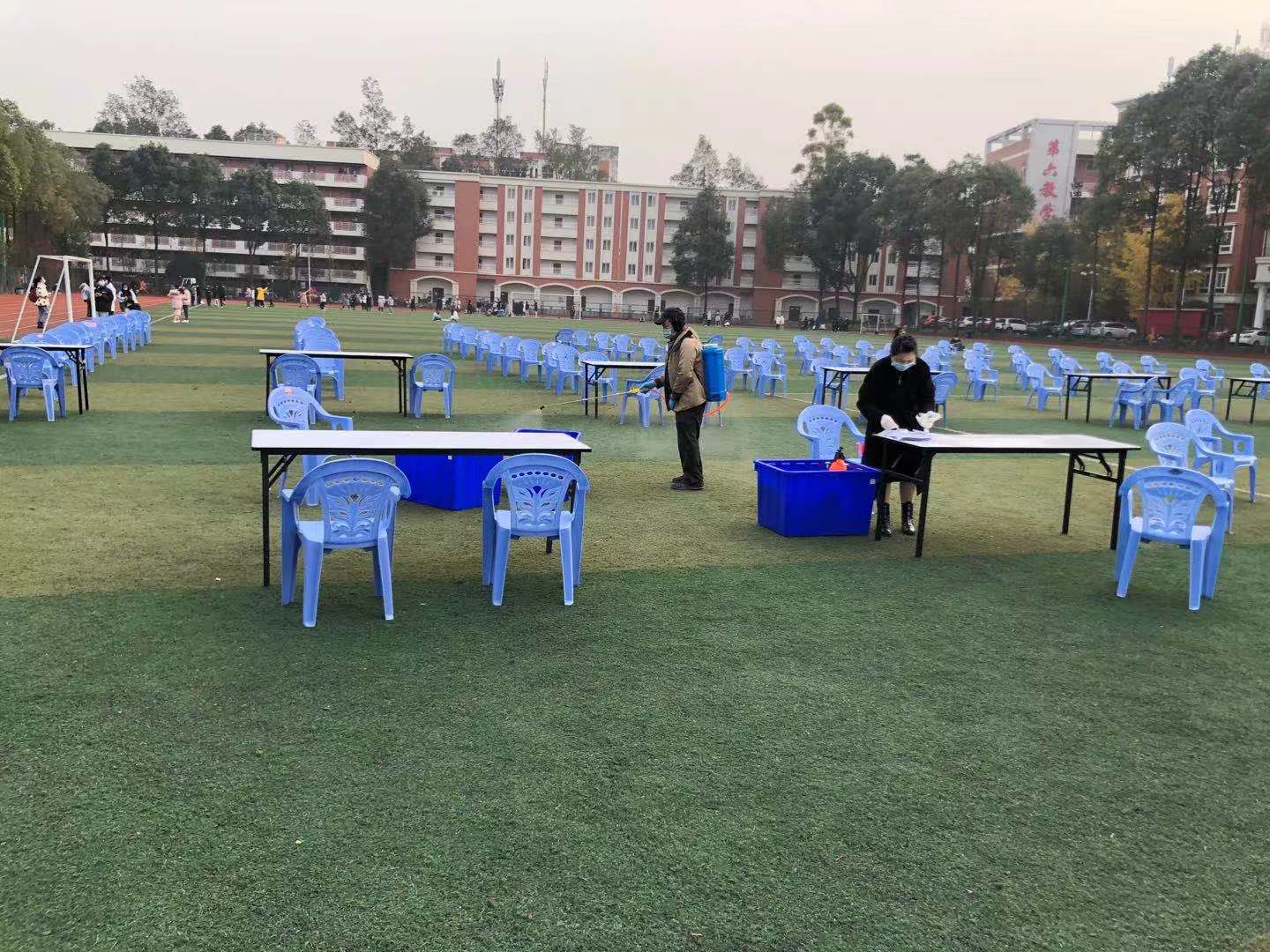 在金牛区疾病预防控制中心的检测人员到位后,全体教职员工戴好口罩排队等候检测,在统一的周密组织下,有序来到篮球场内,依次排成十列纵队按序号进行核酸检测。为了避免人群聚集,学校全体教职员工每人严格按照1.5米间隔距离等候。为安全有序的进行检测,现场设置等待、登记、核酸检测等规定区域和路线。