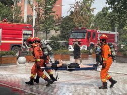 26日10时,校领导及各单位参演人员准备就绪,消防车、救护车也已入场待命。在保卫处的指导下,全体人员详细了解消防逃生演练内容、程序和演练要点。此次消防演练围绕模拟二食堂内厨房厨灶突发火情开展。报警铃响起,食堂内员工及学生在疏导组的引导下弯腰贴墙、捂好口鼻安全有序的疏散撤离,消防组及时赶到现场用消防器材扑救控制“火情”,并救出“伤员”送至医护组进行医疗救治。