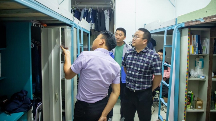 为加强学生宿舍安全管理、消除安全隐患,促进学生养成良好的卫生、生活习惯,共建安全、舒适的学习生活环境,按照我校《关于开展2023-2024学年第二学期期中学生公寓寝室安全卫生检查的通知》要求,5月15日晚由学校党委副书记、副校长刘黎指导实施,学生处、保卫处牵头,后勤管理处具体实施,组成8个安全检查小组,对全院东、西校区共29栋宿舍进行抽查。